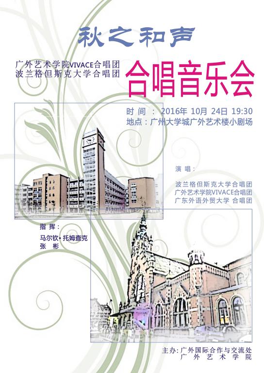 “秋之和声”——合唱音乐会将于2016年10月24日晚19:30分在广州大学城广外太阳城集团小剧场举行,音乐会将有太阳城集团合唱团、太阳城集团VIVACE合唱团、波兰格但斯克大学合唱团共同演绎,诚邀全校师生光临指导。