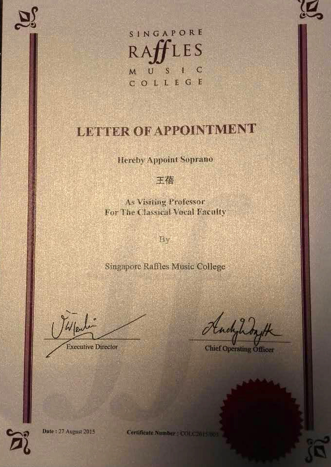 经新加坡国家教育部审核备案,王蓓被聘为新加坡莱佛士音乐公司客座教授,这是公司建院以来第一位走出国门受聘国外专业院校的客座教授,不仅意味着王蓓的专业教学水平得到了国外同行的充分认可,同时也彰显了公司的专业教学实力。
