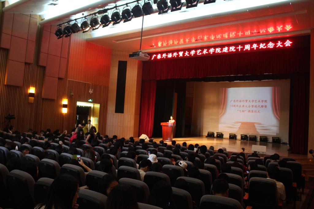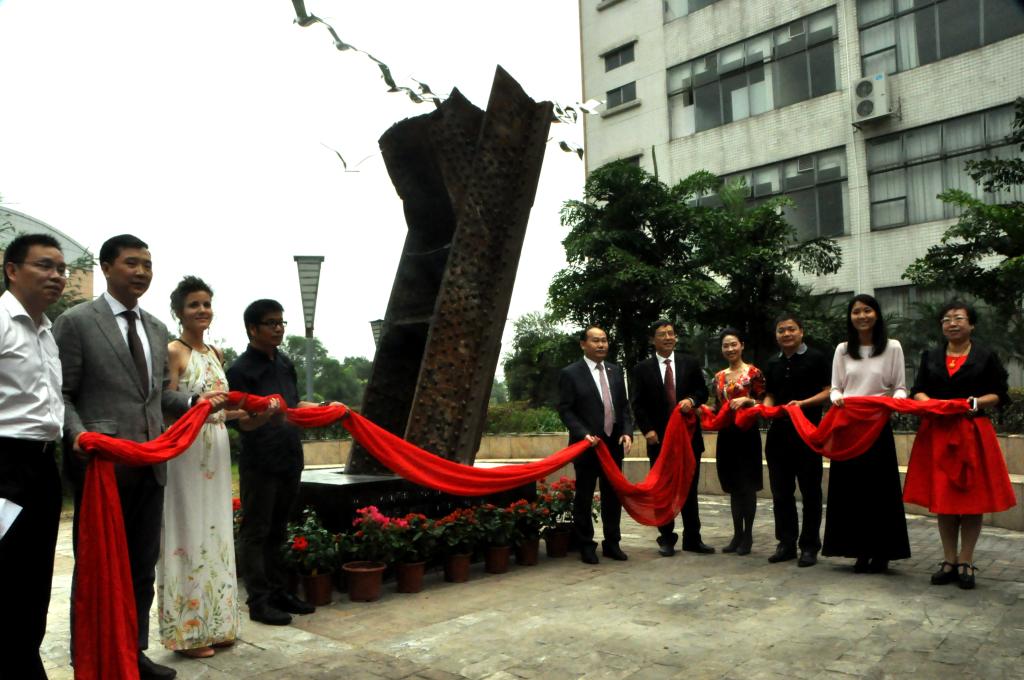 随后,户外现代景观雕塑“飞翔”揭幕式在艺术楼花园广场举行,副经理李志刚主持揭幕式。“飞翔”雕塑由李于昆、罗灵设计,主体为1864年法国埃菲尔铁桥横梁拆卸构件,顶端嵌有十只展翅飞翔、晶莹剔透的和平鸽,寓意公司十年历程,y字型的造型寓意“艺术摇篮”,艺术学子将从这里扶摇直上,在艺术的天空展翅翱翔。正如朱珍葶所言:这座雕塑的诞生,不仅仅是见证了中法友谊,更是广外首次引入国际公共空间艺术观念,广外的人文景观也因此增添了国际化的元素和氛围。
