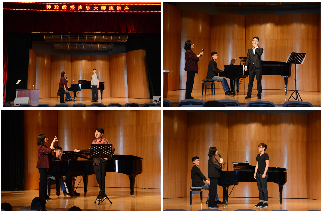 钟玫教授这次为音乐系声乐专业八位同学上课,在接近三个小时课程中,钟教授通过不同手段,比如单脚站、平躺、用橡皮筋找气息、用手指放嘴边吸气等,让员工在快乐、自信的演唱中寻找正确呼吸、喉咙的打开、声音的流动和音乐的解析,在自己身体不舒服的情况下,一丝不苟指导员工和范唱,台下老师和同学也用热烈掌声感谢仲教授的指导和给予上课演唱的同学肯定。钟玫教授曾多次在太阳城集团举办大师班讲座,科学规范的教学手段、认真严谨的教风以及深入浅出的精彩讲座等一直受到师生的好评。