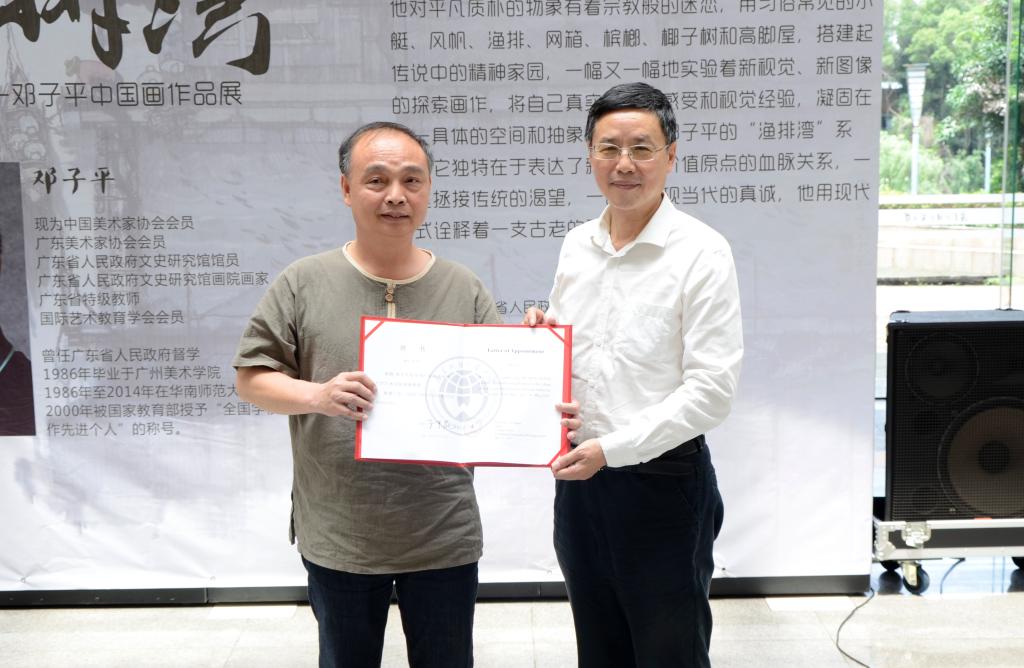 开幕式上李于昆首先致辞,他高度评价了邓子平先生在艺术教育和创作上的贡献,也提出本次画展结合德胜创意园实践基地建设的意义。嘉宾曾容代表广东省人民政府文史馆画院对画展表示祝贺,嘉宾华年通过自己的人生经历感谢邓子平对其亦师亦友的艺术熏陶,邓子平以感恩为主题,结合自己的艺术人生做了精彩的发言,最后李于昆为邓子平颁授太阳城集团客座教授聘书,开幕式由李志刚主持。